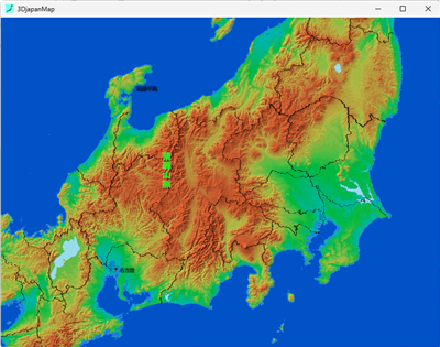 (例) 赤石山脈を追加したようす。文字列を縦書きにし、色は緑で、●-は なしに設定。 |