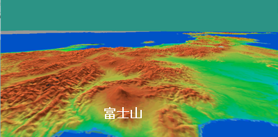 山の高さの変更 メニューの (例) 富士山付近のようす。 *画面の立体地図で、静岡県の東端から西端の距離(約155Km)を15cmになるようにした場合、富士山の高さ(3776m)は、3.65mmにしかならない。 |