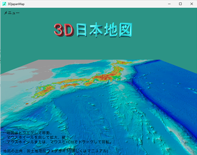 | ・社会や理科の学習に利用するといいでしょう。地図に県名や山、河川名などを書き込めるので、オリジナルの地図を作ることができます。 ・山の高さを実際の何倍にもできるので、地形をより把握しやすくなります。 ・終了するとき、または、なんらかの原因で動作がおかしくなったときは、画面右上の×をクリックするか、Altキーを押しながらF4キーを押します。 ・地図は移動と回転があるので、操作が少々面倒です。常に移動モードにしておき、回転させたいときはマウスホイールを押しながら ドラッグするというのがシンプルなので推奨しますが、マウスホイールを押し続けると指に負担がかかります。 ・地図は国土地理院のデータを利用しているので、ほぼ正確です。 ただし、分割したものをつなぎ合わせているので、多少、ズレがあります。また、沖縄より下の島の山は高くできません。 |
